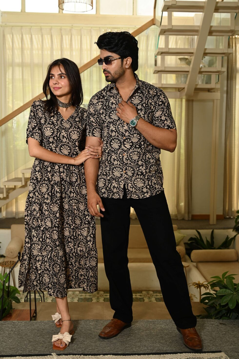 This Black floral Printed couple matching outfit includes a women?s flowy cotton midi dress and a men?s short-sleeve printed shirt. Designed with cheerful floral prints, this set is perfect for summer outings, casual gatherings, or twinning on vacations.